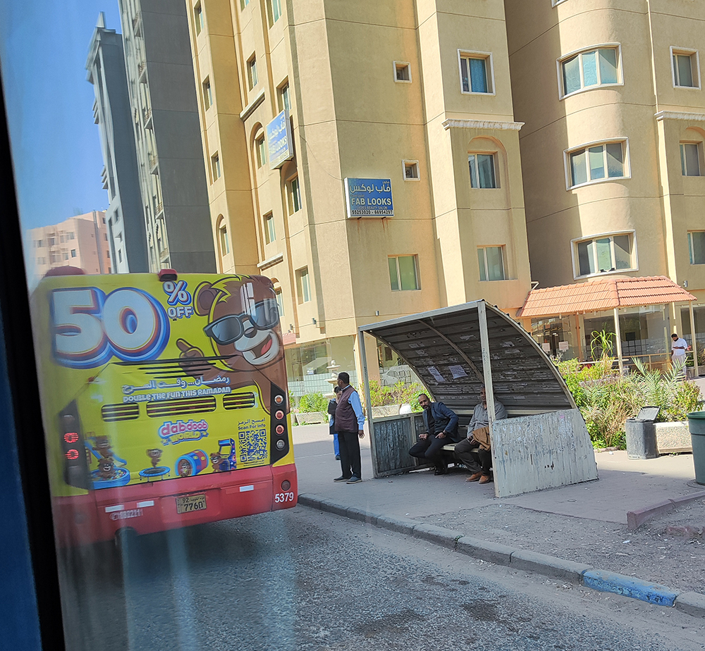 В автобусе. На другом автобусе написано: ‘Double the fun this Ramadan’.