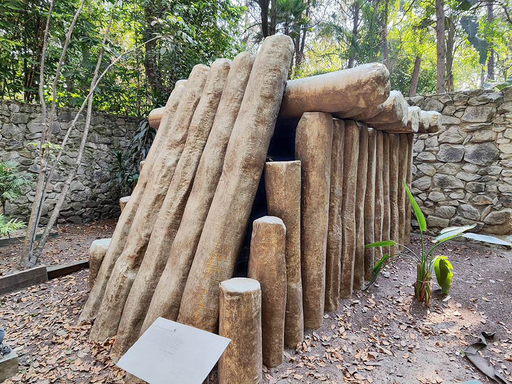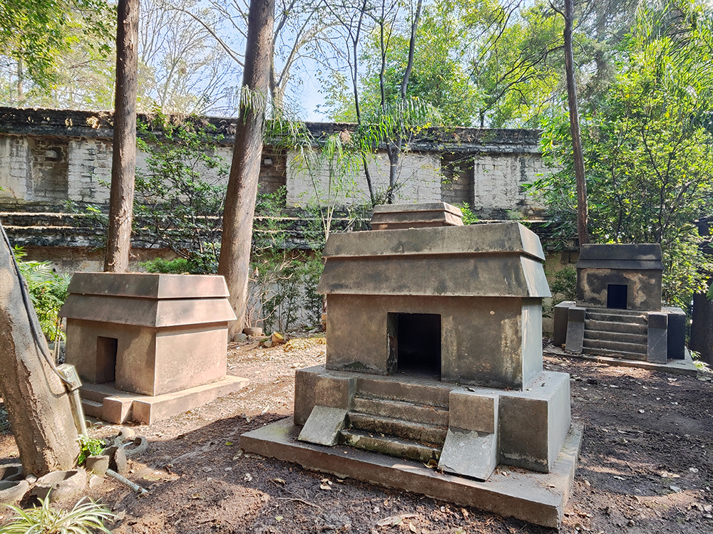 Группа древних каменных моделей мексиканских храмов-пирамид в натуральную величину, установленных под открытым небом среди деревьев. Самая крупная модель в центре, с широкой лестницей и прямоугольным проёмом, напоминает классические теокалли (храмы) доколумбовой эпохи.