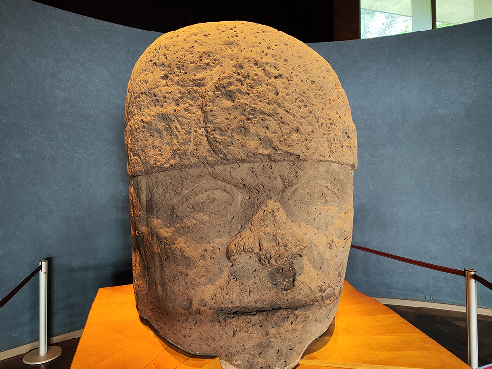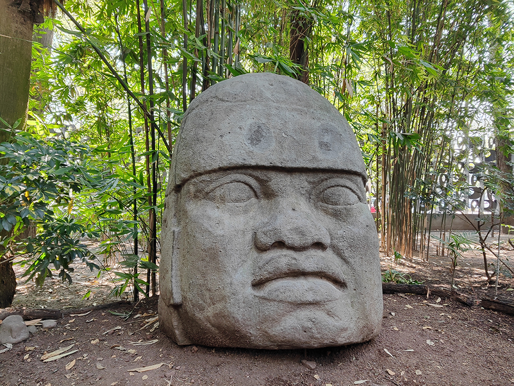 Одна из знаменитых мексиканских колоссальных каменных голов ольмекской цивилизации. Оригинальная скульптура высотой около 3 метров, высечена из цельного базальтового монолита, весит десятки тонн. Лицо с толстыми губами, широким носом и характерным шлемообразным головным убором — типичный портрет правителя или важной персоны культуры ольмеков (около 1200–400 гг. до н.э.).