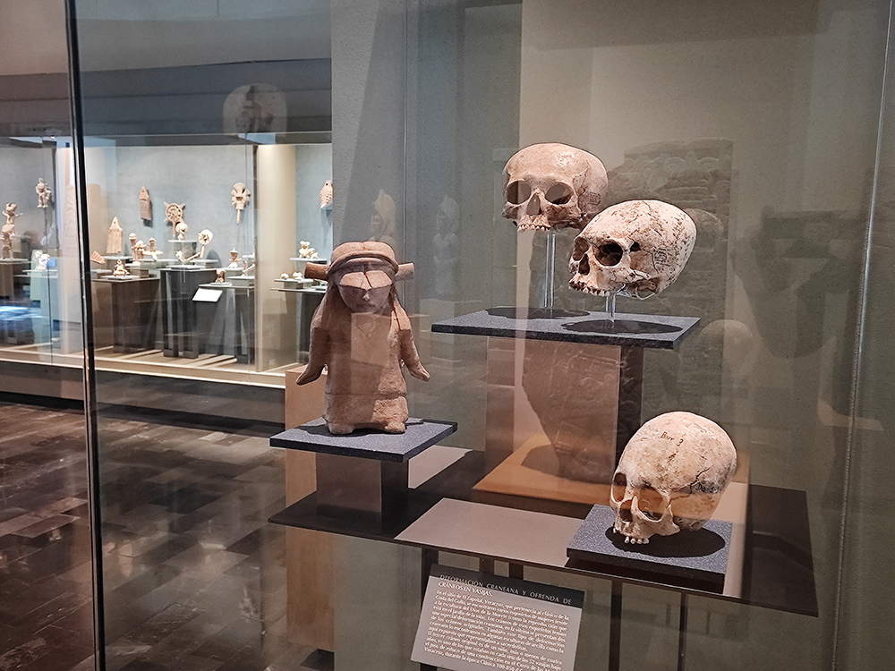 Витрина с древними мексиканскими артефактами: в центре глиняная фигурка человека в головной повязке, вокруг неё на подставках три человеческих черепа с ярко выраженной искусственной краниальной деформацией (удлинённой, конической формы). На заднем плане видны другие небольшие скульптуры и керамические изделия доколумбового периода.