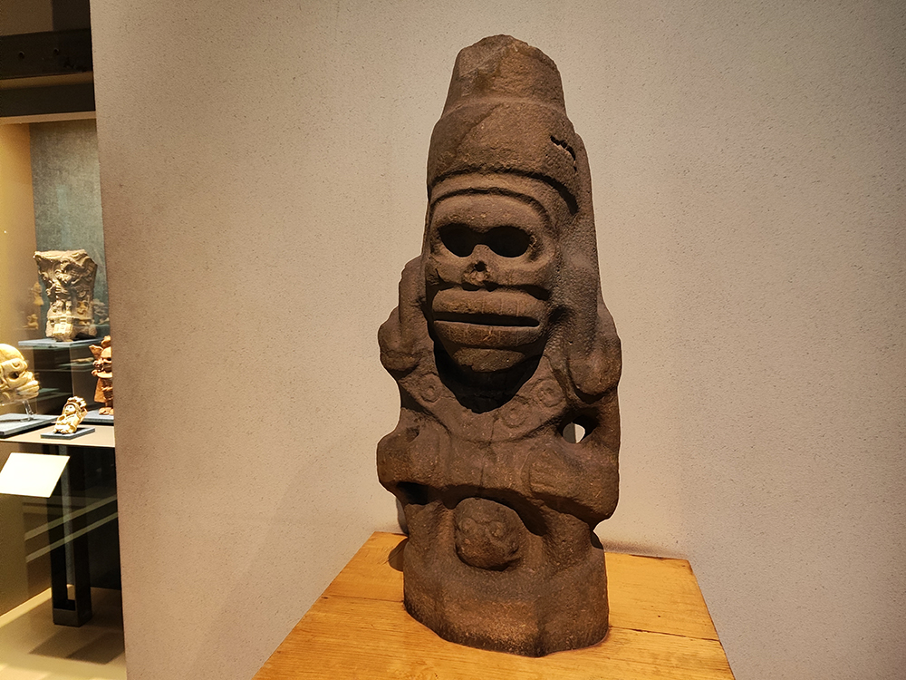 Каменная скульптура бога Шипе-Тотека в образе ободранного (с содранной кожей), выполненная в ацтекском стиле. Это один из характерных мексиканских изваяний позднего постклассического периода, символизирующих цикл смерти и возрождения.