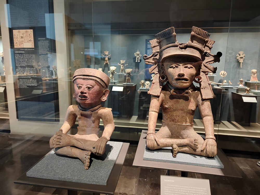 Слева — сидящая мужская фигура в простой повязке на голове и ожерелье, с выразительным лицом и скрещёнными ногами. Справа — более крупная и детализированная фигура знатного человека или божества в сложном головном уборе с перьями и орнаментами, с серьгами и ожерельем, также в позе лотоса. Обе скульптуры выполнены в характерном красно-коричневом цвете обожжённой глины, типичном для древней месоамериканской керамики. На заднем плане видны другие маленькие фигурки и ритуальные предметы той же эпохи.