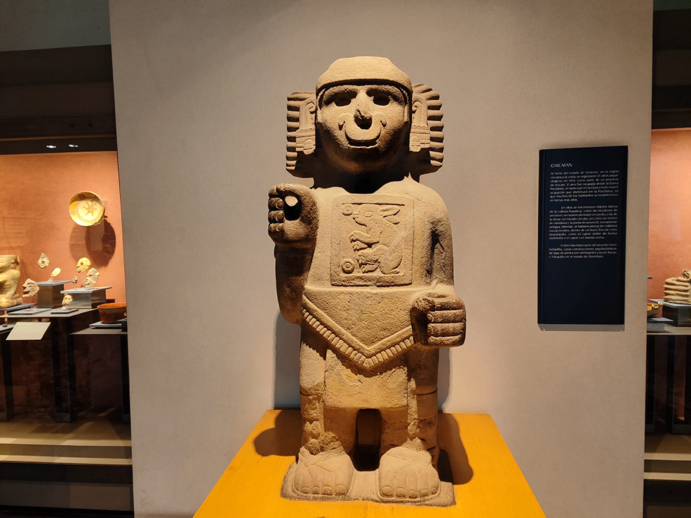 Каменная скульптура мексиканского божества Чак-Мооля — фигуры в позе полулежащего человека с чашей на животе для подношений. Над ним возвышается массивная голова Тлалока, бога дождя и плодородия, с характерными кольцевидными глазами, клыками и сложным головным убором из перьев и змей. Сбоку — рельефы с масками и символами, типичными для центральномексиканского стиля (тольтекско-ацтекского). Экспонат выполнен в классической мезоамериканской манере из вулканического камня.