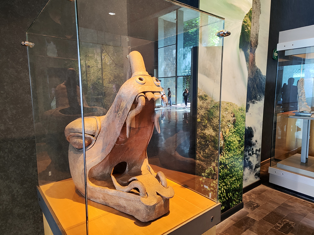 Крупная глиняная голова мифического зверя — земноводного ягуара с разинутой пастью, клыками и длинным изогнутым языком. Артефакт выполнен в характерном мексиканском стиле доколумбовой эпохи, с выразительными чертами лица, круглыми глазами и рельефными деталями.