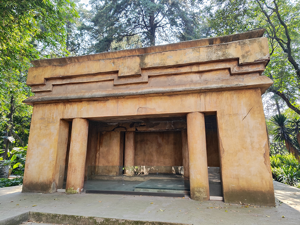 Миниатюрная копия храма Кетцалькоатля в Теотиуакане, выполненная в характерном мексиканском стиле талауд-таблеро с массивными колоннами и ступенчатым карнизом. Экспонат передаёт архитектуру древнего церемониального центра с плоской крышей и открытой передней частью, поддерживаемой толстыми цилиндрическими колоннами.