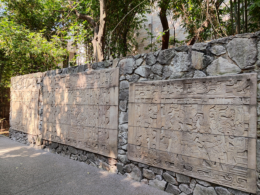 Точные современные копии-реконструкции фрагментов мексиканских каменных рельефов ацтекского периода, выполненные в характерной манере с плотным заполнением плоскости сложными орнаментами, геометрическими узорами и стилизованными фигурами божеств, воинов и мифологических существ. Поверхность разделена на горизонтальные регистры, как на оригинальных стелах и стенах древних храмов.