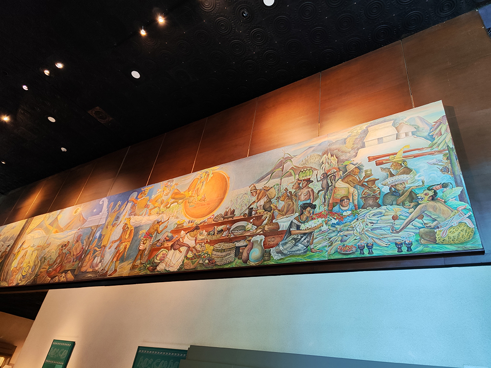 Большая настенная роспись в мексиканском стиле, изображающая повседневную жизнь и труд коренных народов доиспанской эпохи: люди собирают урожай агавы и кукурузы, носят сомбреро, плетут корзины, готовят тортильи, несут кувшины с пульке, торгуют на рынке. Композиция яркая, насыщенная деталями, с характерным для мексиканского монументального искусства сочетанием тёплых и холодных тонов, от рассвета слева до дневного света справа.