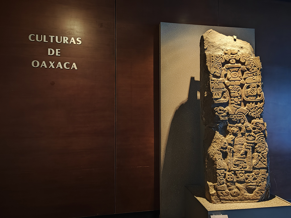 Древняя каменная стела культур Оахаки с богатым рельефным декором: в верхней части — сложная композиция с антропоморфными и зооморфными фигурами в характерных головных уборах, ниже — вертикальные колонки глифов и изображений персонажей в ритуальных позах. Поверхность сильно выветрена, что придаёт рельефу мягкость и подчёркивает древность памятника.
