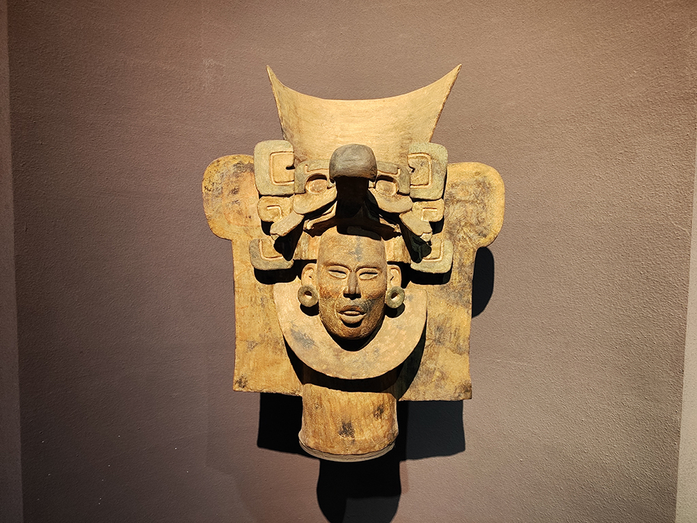 Крупный древний керамический сосуд-жаровня в виде стилизованного человеческого лица с огромными круглыми глазами, длинным носом-лопаткой и зубастым ртом-щупальцем. Голова увенчана высокой сложной короной с рельефными фигурами и орнаментами в типично мексиканском стиле.