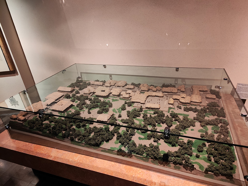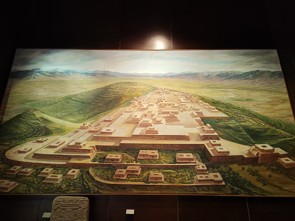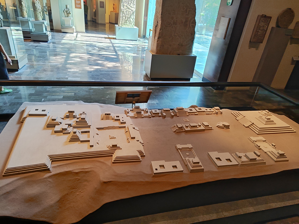 Детальная масштабная модель древнего города с центральным архитектурным комплексом, состоящим из нескольких платформ, пирамид и прямоугольных сооружений, характерных для мексиканской доколумбовой архитектуры. Вокруг комплекса — обширная территория с имитацией пустынного ландшафта, редкими кустами, кактусами и небольшими зелёными участками, обозначающими оазисы или возделываемые поля. Модель передаёт планировку крупного церемониального и жилого центра в окружении природной среды.