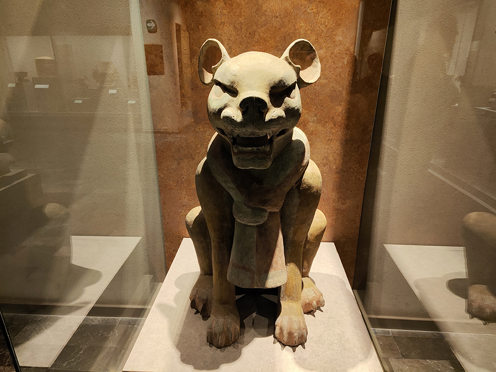 Мексиканская керамическая скульптура периода шахтовых гробниц (штаты Халиско, Наярит, Колима, примерно 200 г. до н.э. — 500 г. н.э.). Изображает толстого сидячего пса (часто называемого «колимским псом») с открытой пастью, короткими лапами, хвостом, завязанным узлом на спине, и характерными ушами-«рожками». Такие собаки в культуре Западной Мексики считались проводниками душ в загробный мир и часто сопровождали умерших в могилу. Сосуд или фигура выполнена из светло-коричневой обожжённой глины, с выразительными чертами морды и подчеркнутым животом.