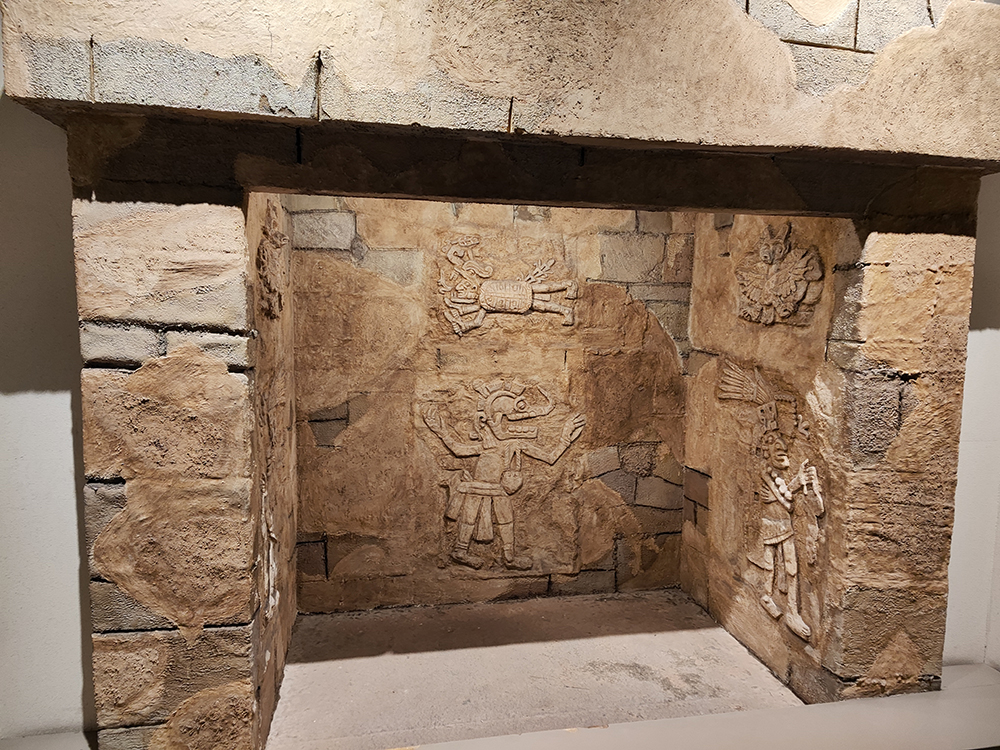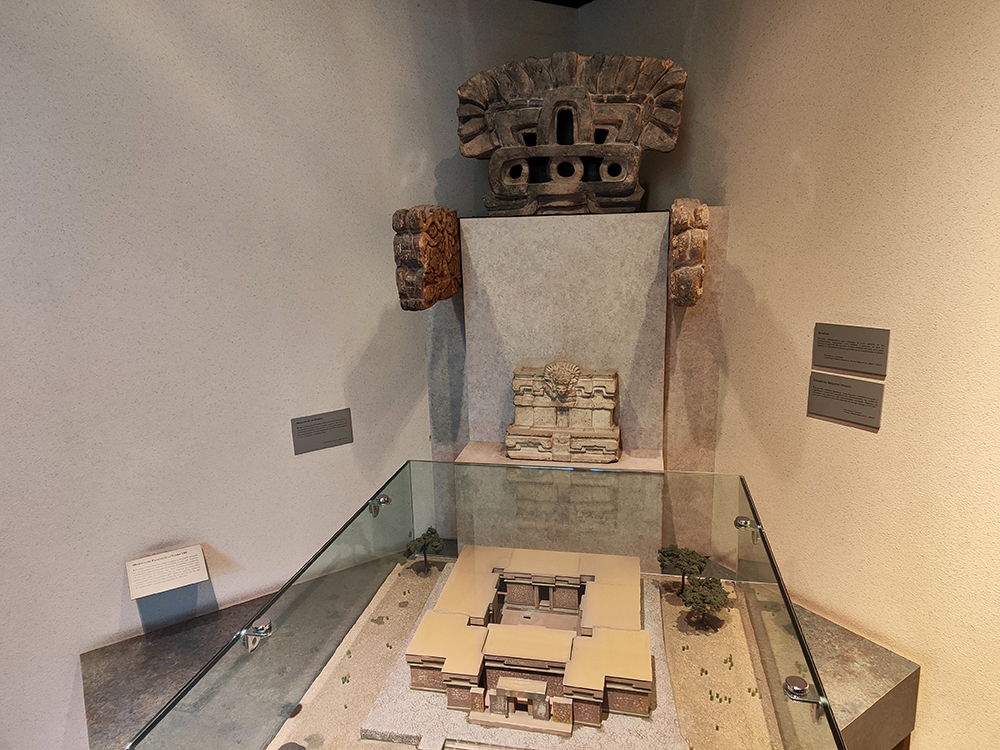 Реконструкция главного храма ацтеков (Уэйи-Тлалок, или Тemplo Mayor) в миниатюре, дополненная подлинными каменными фрагментами оригинального сооружения. На макете видна характерная двухчастная пирамида с двойной лестницей и двумя святилищами на вершине. Над моделью установлены аутентичные скульптуры: вверху — огромный диск Койольшауки (лицо богини Луны, вырезанное из камня), по бокам — головы койотов (символы воинского культа), а ниже — уменьшенная копия знаменитого «Чак-Мооля» (фигуры носителя подношений). Всё вместе даёт представление о грандиозном мексиканском храме, посвящённом богам Уицилопочтли и Тлалоку.