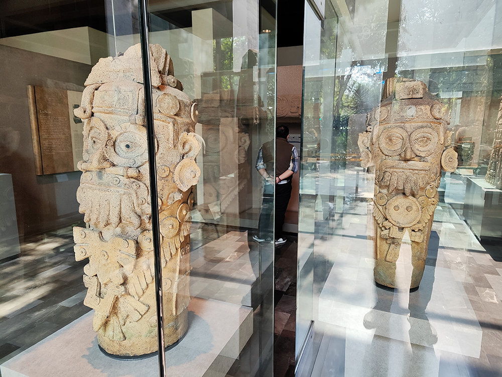 Две массивные каменные скульптуры в характерном мексиканском доколумбовом стиле: высокие цилиндрические фигуры с крупными круглыми глазами, широкими носами, выступающими зубами и сложными рельефными украшениями в виде змей, масок и геометрических орнаментов. Одна из статуй увенчана изображением божества или правителя в головном уборе, вторая — более лаконичная, но с ярко выраженным лицом и руками, прижатыми к телу. Обе выполнены из пористого вулканического камня и покрыты следами древней резьбы.