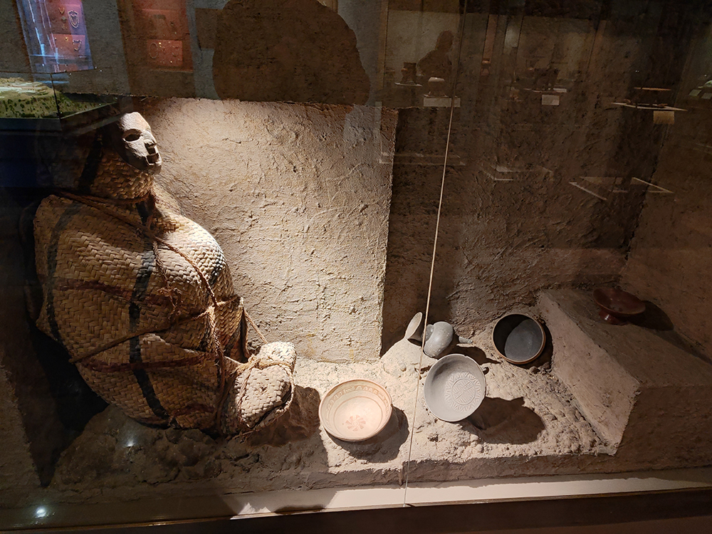 Это погребение молодого человека ацтекского периода (примерно XV–начало XVI века), найденное в позе сидящего с поджатыми ногами. Тело полностью покрыто плетёными циновками и верёвками, что было характерно для захоронений знати или жрецов. Перед ним расставлена погребальная утварь: несколько керамических сосудов и мисок с росписью, в том числе знаменитые чёрно-оранжевые и полихромные чаши ацтекского стиля, а также маленькая курильница. Всё это составляло часть ритуального приношения для загробной жизни.
