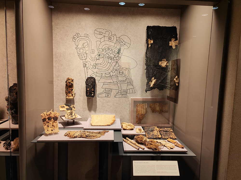 Витрина с подлинными фрагментами мексиканских кодексов майя: кусками коры, покрытой штуком и исписанной иероглифами и изображениями. Среди экспонатов — несколько свёрнутых и развёрнутых листов, обугленные и потемневшие от времени, а также отдельные фигурные элементы. На задней стене витрины крупное графическое изображение божества или правителя майя в характерном сложном головном уборе и с ритуальными предметами в руках. Всё это подлинные остатки доколумбовых книг-ширм, созданных в доиспанский период.