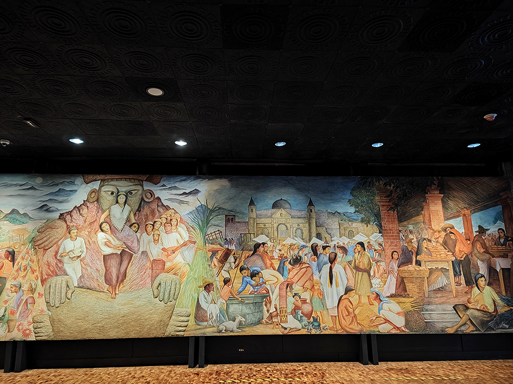 Гигантская настенная роспись в мексиканском стиле, изображающая повседневную жизнь людей разных эпох и социальных слоёв. Слева доминирует огромное мифологическое существо — древнее божество или дух земли — с суровым лицом, держащее в объятиях группу людей. Справа — оживлённая рыночная площадь с колониальной церковью на заднем плане, торговцами, ремесленниками, женщинами в традиционных одеждах, детьми и животными. Всё выполнено в тёплых тонах с богатой детализацией, сочетающей доиспанские мотивы и реалии колониального и современного периода.