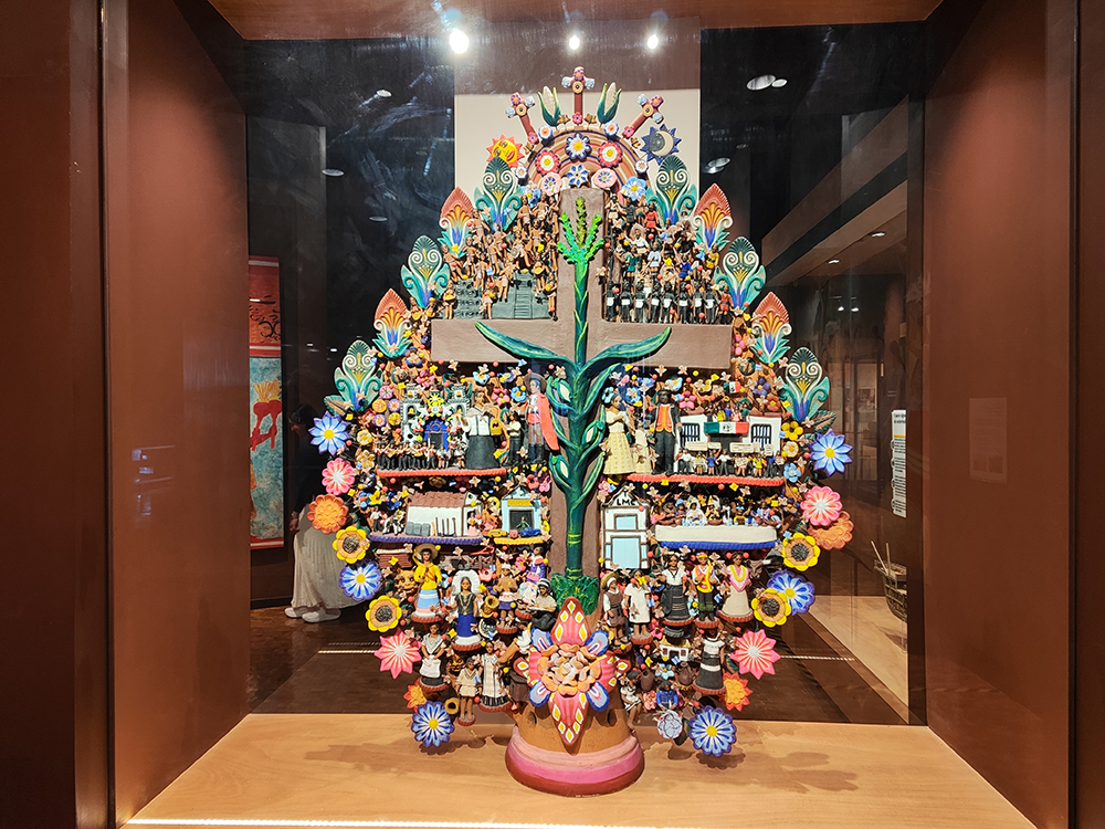 Это мексиканское «Древо жизни» (Árbol de la Vida) в форме креста — традиционная керамическая скульптура из обожжённой глины, расписанная яркими красками. На ветвях и стволе размещены десятки миниатюрных фигурок: люди в народных костюмах, ангелы, музыканты, сцены повседневной жизни и религиозные сюжеты. Центральный ствол украшен крупным изображением Девы Марии Гваделупской, а верх завершает пышная крона с цветами, птицами и солнцем-луной. Всё произведение насыщено символикой, сочетающей католические и доколумбовые мотивы.