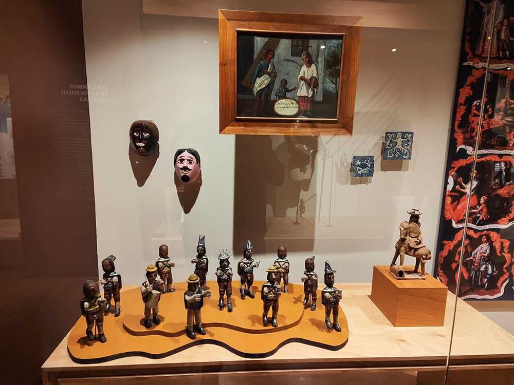 Витрина с традиционными мексиканскими глиняными фигурками и масками. В центре — группа маленьких расписных солдатиков и музыкантов в синих мундирах и шляпах, стоящих полукругом на жёлто-коричневой подставке. Справа отдельно стоит фигурка всадника на коне на деревянном постаменте. Выше висят две керамические маски: одна чёрная с белыми зубами, другая розоватая с чёрными усами и бородой. На стене за экспонатами — старинная картина в деревянной раме и несколько изразцов с сине-белым орнаментом. Всё вместе представляет яркий образец мексиканского народного искусства из глины.
