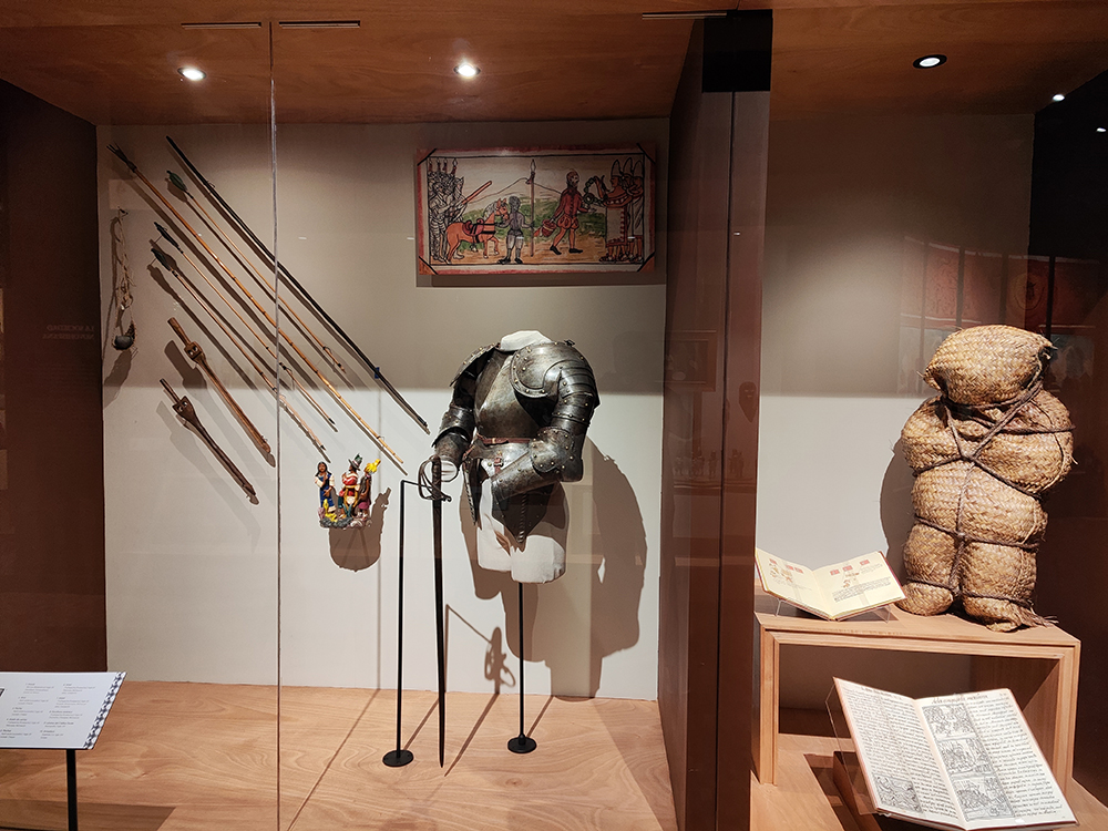 Витрина с экспонатами доколумбового и раннеколониального периодов. В центре — стальной испанский нагрудник и шлем-морион XVI века на манекене. Слева — связка мексиканских стрел с обсидиановыми и костяными наконечниками и макуауитль (деревянный меч-дубина с обсидиановыми лезвиями). Над доспехом — репродукция страницы из кодекса XVI века с изображением конкистадора и воинов-ацтеков. Справа — ритуальная фигура, полностью обёрнутая и перевязана верёвками (традиционная жертва богам). Внизу открытая книга — facsimile кодекса с иллюстрациями и текстом на науатль и испанском. Всё вместе иллюстрирует момент столкновения двух миров в XVI веке.