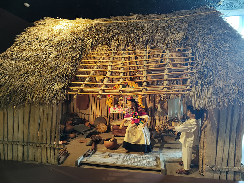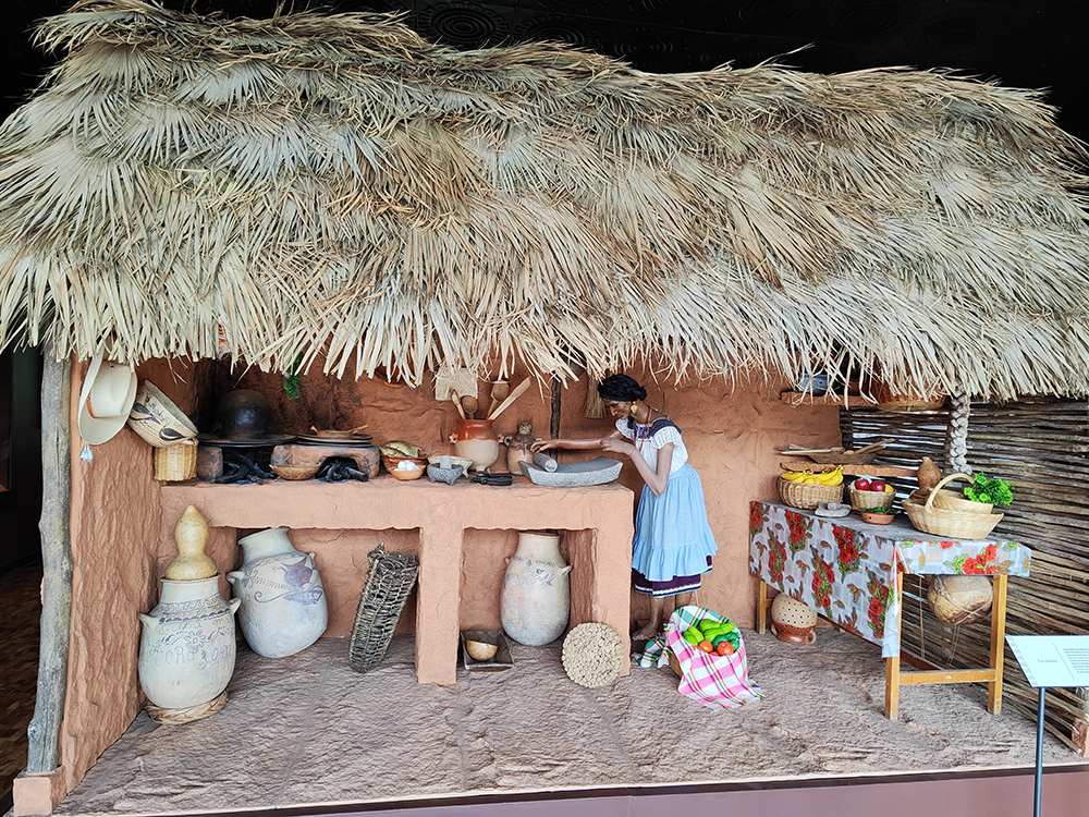 Реконструкция традиционного мексиканского сельского жилища с крутой соломенной крышей из пальмовых листьев, стенами из деревянных жердей и открытым интерьером. Внутри манекены изображают повседневную жизнь: женщина в ярком мексиканском народном платье с вышитой блузкой, широкой юбкой, шляпой и гирляндами из цветов стоит за столом с утварью, а рядом фигура в белой одежде, возможно, ребёнок или другой член семьи. На полу и полках расставлены глиняные горшки, корзины, метаты для измельчения кукурузы, комаль и другие предметы быта, иллюстрирующие традиционный домашний уклад коренных народов.