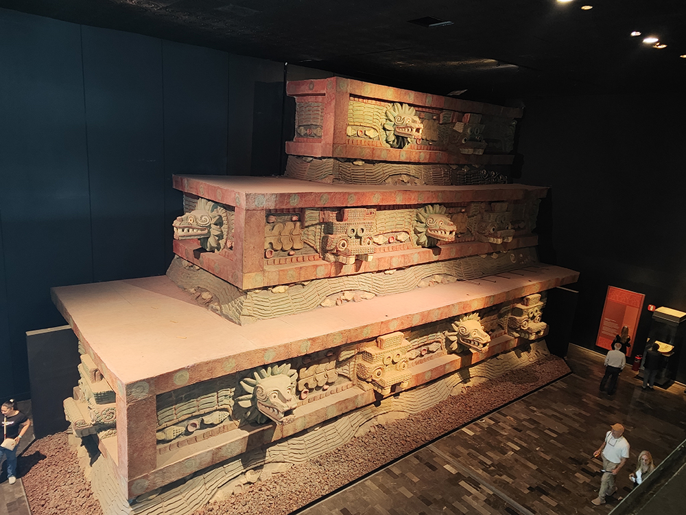 Крупная реконструкция фасада древней ступенчатой пирамиды в стиле талуд-таблеро, украшенная выступающими скульптурными головами пернатых змеев с открытыми пастями, перьями и зубами, а также рельефами волнообразных тел змей, раковин и других символов. Поверхность окрашена в красные, зелёные и бежевые тона, имитирующие оригинальную полихромию мексиканского памятника теотиуаканской культуры.