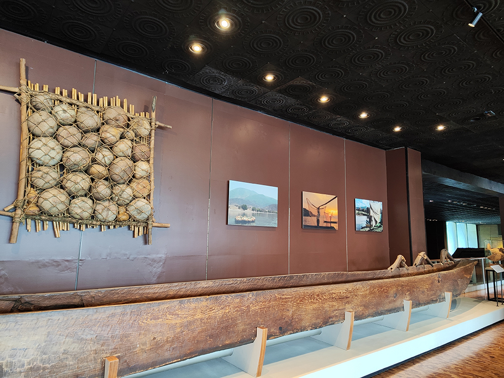 Древняя мексиканская лодка-моноксилон (выдолбленная из единого ствола дерева) с реконструкцией рыболовной сети, утяжелённой множеством круглых каменных грузов, закреплённых в сетке из верёвок на деревянной раме из палок. На стене за экспонатом висят три фотографии, иллюстрирующие традиционное использование подобных лодок и сетей для рыбной ловли.