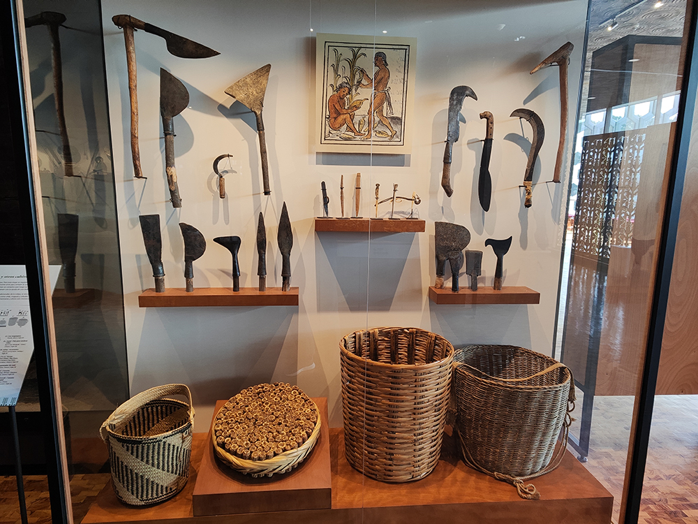 В центре витрины — деревянная соха (коа) в виде большой изогнутой палки с рукоятью, используемая для обработки земли с помощью человеческой силы.