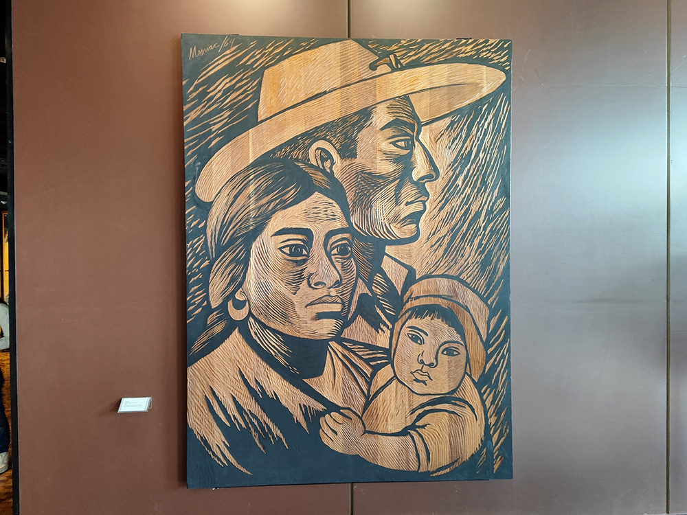 Крупный мексиканский гравюрный оттиск на дереве (ксилография), изображающий портрет семьи: мужчина в широкополой шляпе, женщина с серьёзным взглядом и ребёнок на её руках. Композиция выполнена в экспрессивной манере с густыми штрихами, создающими драматический фон из волнообразных линий, подчёркивающих единство фигур и их задумчивые выражения лиц. В верхнем левом углу — подпись художника.