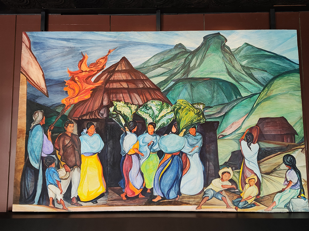Картина в мексиканском стиле, изображающая группу коренных жителей сельской местности: женщины в ярких традиционных платьях несут на головах большие корзины с зелёными овощами и растениями, мужчины, дети и пожилые люди вокруг них; на переднем плане дети играют или работают, слева горит крыша соломенного дома с языками пламени, на заднем плане — зелёные холмы и горы под облачным небом.