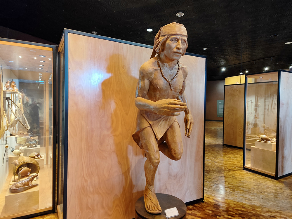 Деревянная скульптура, изображающая древнего человека в динамичной позе бега или прыжка: мускулистое тело, повязка на голове, ожерелье из бус на шее, минимальная одежда в виде набедренной повязки. Фигура выполнена в реалистичном стиле, с детальной проработкой лица, мышц и анатомии, на круглом постаменте. Вокруг — витрины с мексиканскими артефактами, включая фигурки животных и другие экспонаты.