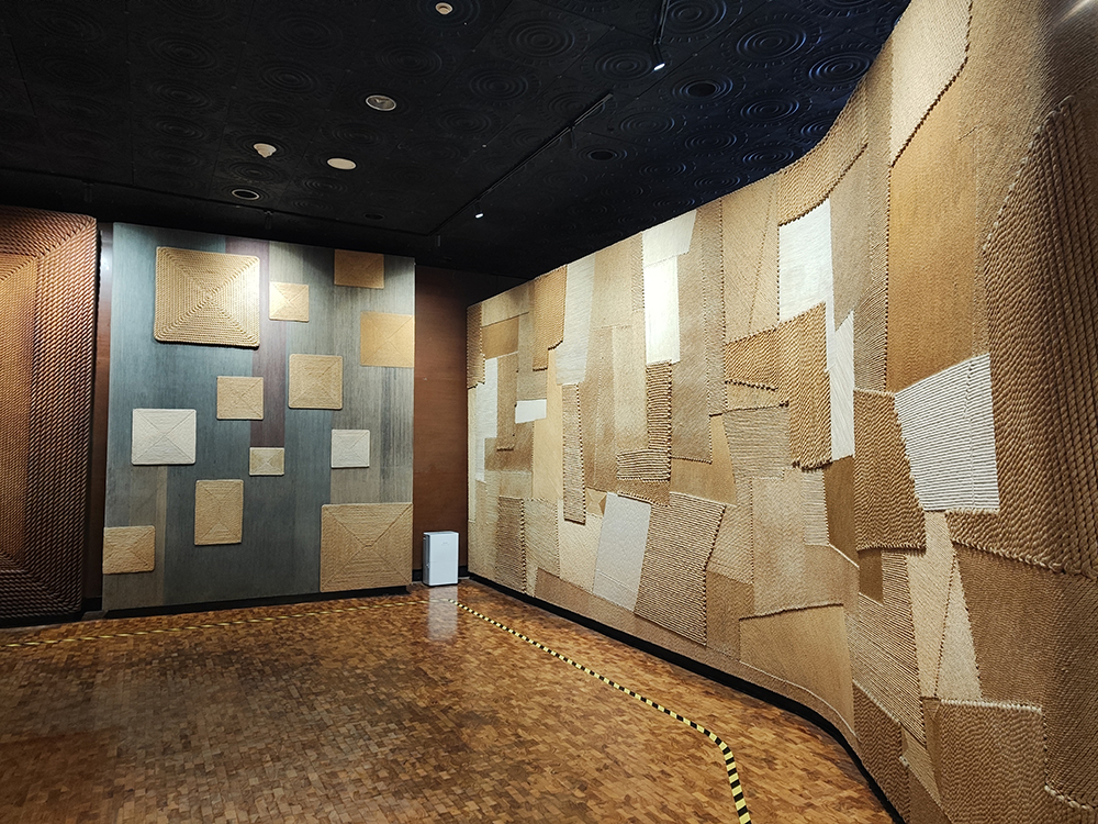 Интерьер зала с экспозицией традиционного мексиканского текстильного искусства: стены покрыты крупными рельефными панелями из плетёных и витых волокон в оттенках бежевого, коричневого и белого, образующими абстрактные геометрические узоры и текстуры, напоминающие верёвки, шнуры или соломенные маты. Потолок тёмный с орнаментом в виде концентрических кругов, пол выложен деревянными плитами, по краю проходит жёлто-чёрная разметочная лента. Пространство пустое, освещённое мягким искусственным светом, подчёркивающим фактуру материалов.