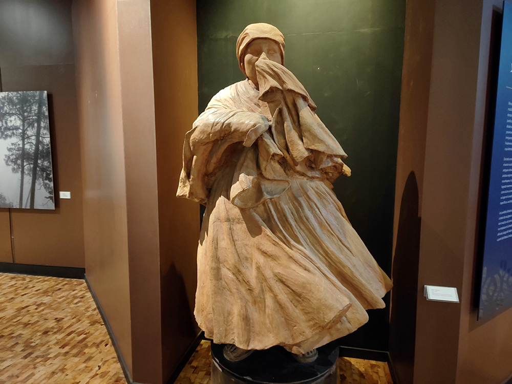 Скульптура из терракоты, изображающая женщину в традиционной мексиканской одежде: длинной юбке и блузке с длинными рукавами. Она стоит на постаменте, подтягивая руками край ребосо (шали) к лицу, полностью закрывая рот и нос тканью, оставляя открытыми только глаза. Фигура передаёт эмоцию стыда, скорби или плача, с детально проработанными складками одежды, подчёркивающими движение и объём.