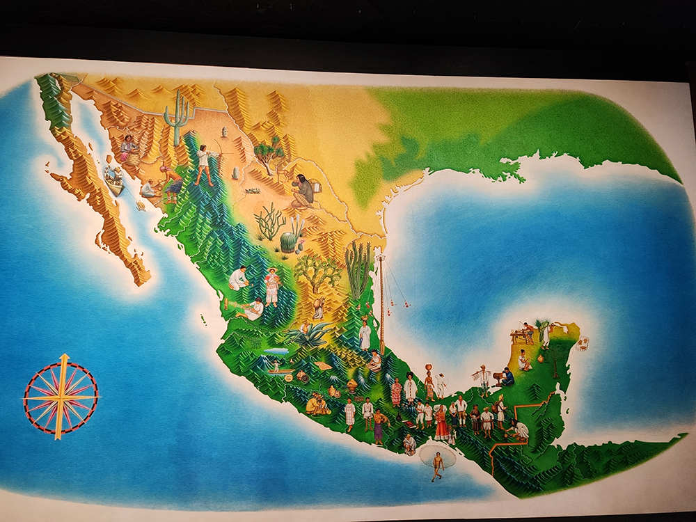 Крупная красочная иллюстрированная карта, изображающая разнообразные ландшафты и регионы с характерными природными особенностями: пустыни с кактусами и сагуаро на севере, густые тропические леса на юге и востоке, горные хребты и равнины в центре. По всей карте размещены многочисленные фигурки людей в традиционной мексиканской одежде — мужчины и женщины разных этнических групп занимаются повседневными делами: рыбалкой, земледелием, сбором агавы, ткачеством, танцами и ритуалами. В нижнем левом углу — стилизованная роза ветров. Изображение выполнено в ярких тонах с преобладанием зелёного, жёлтого и синего, подчёркивающих культурное и этнографическое богатство страны.