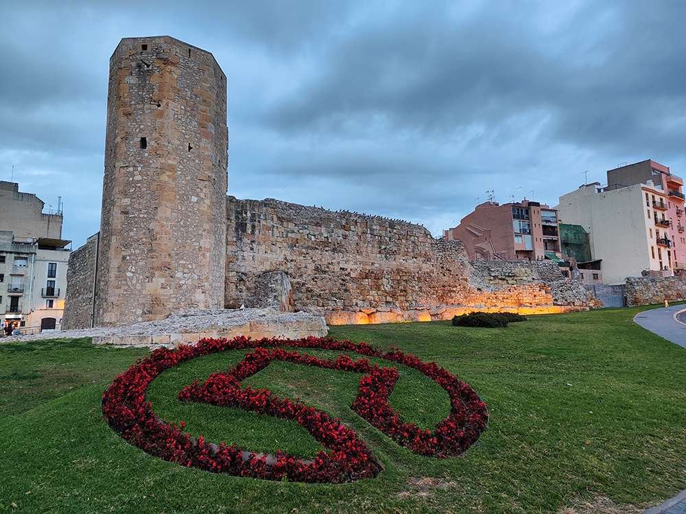 Круглая клумба с красными цветами на переднем плане изображает эмблему кастельеров (castells — традиционные человеческие башни, символ Таррагоны как “города человеческих башен”). Это популярный мотив в местных парках и декорациях, подчёркивающий культурную традицию региона.