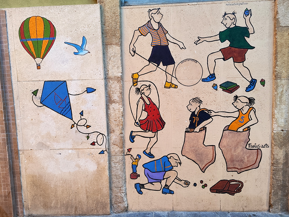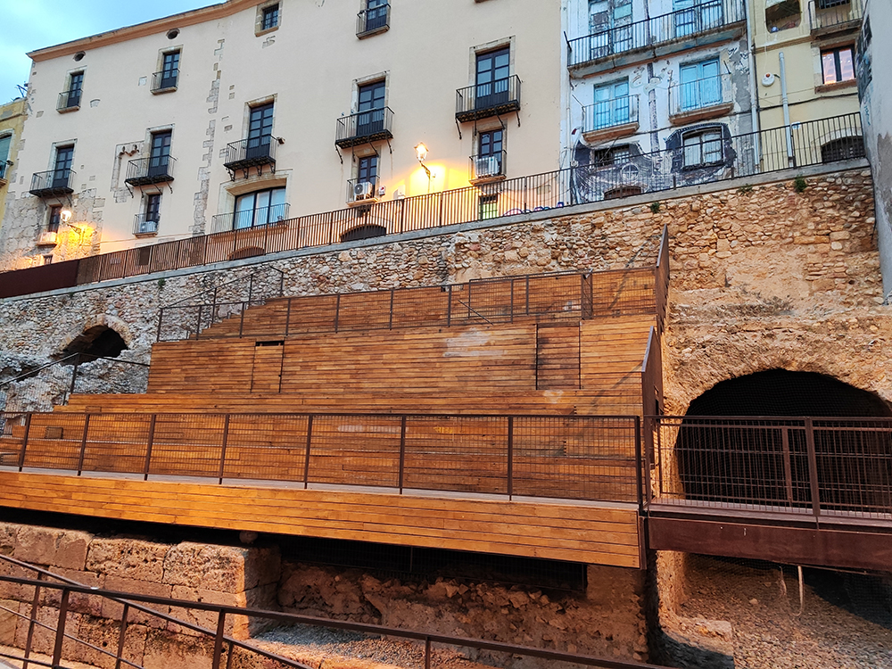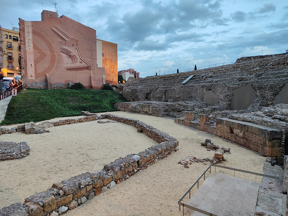 На заднем плане виден фасад здания с большой фреской (муралом), изображающей сам амфитеатр — это современное художественное оформление, подчёркивающее историческое значение места и интегрированное в городской ландшафт Таррагоны.