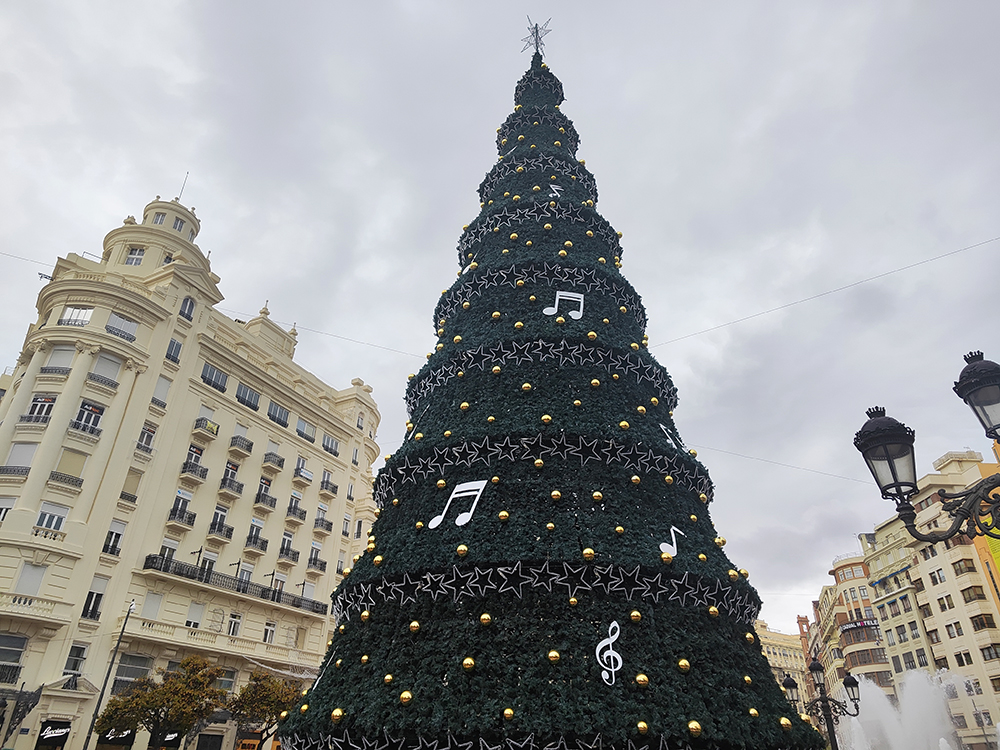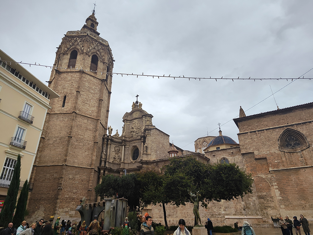Фотография снята со стороны Площади Девы Марии (Plaza de la Virgen), где на Рождество традиционно устанавливают большой вертеп (belen — рождественский вертеп с фигурами) и фонтан Турии. Люди на переднем плане смотрят именно на него.