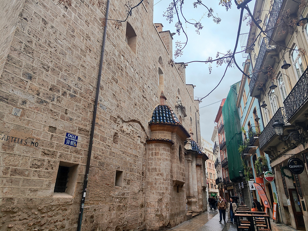 Она расположена на улице Calle de las Mantas (ул. Мантий), недалеко от Центрального рынка (Mercado Central) и Шёлковой биржи (Lonja de la Seda), в историческом центре города. Это барочная церковь XVII–XVIII веков с характерной каменной фасадной стеной, маленькими куполами, покрытыми синей черепицей, узкими окнами и нишами. Улица узкая, с типичными валенсийскими балконами и барами (включая ирландские пабы с вывесками Guinness).