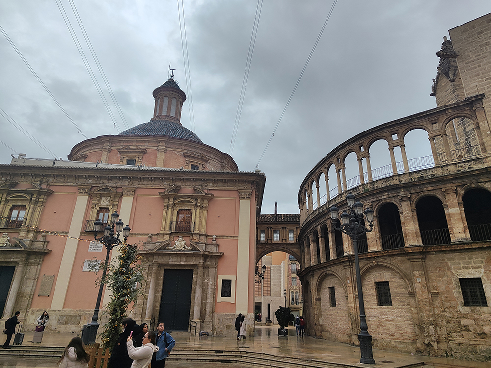 Слева: Basílica de la Virgen de los Desamparados (Базилика Девы Покинутых) — барочная церковь XVII века с характерным куполом, покрытым голубой черепицей. Она посвящена покровительнице Валенсии — Деве Покинутых (Mare de Déu dels Desemparats).