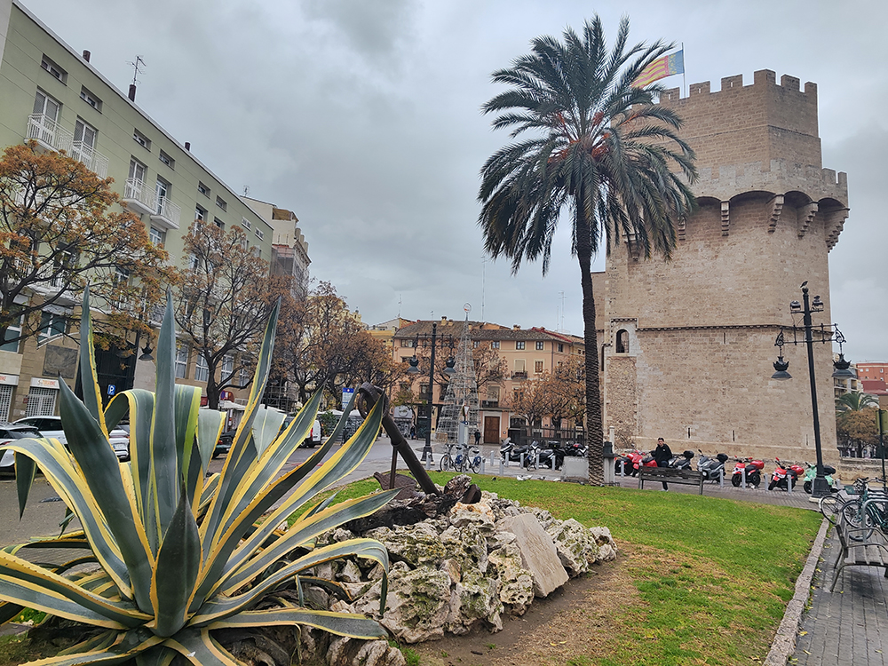 На фото видны характерные черты: две многоугольные башни с зубцами, флаг Валенсии наверху, а также элементы окружения — пальма, агавы и якорь (это памятник, подаренный Королевской испанской морской лигой, расположенный в небольшом парке у башен в садах Турии).