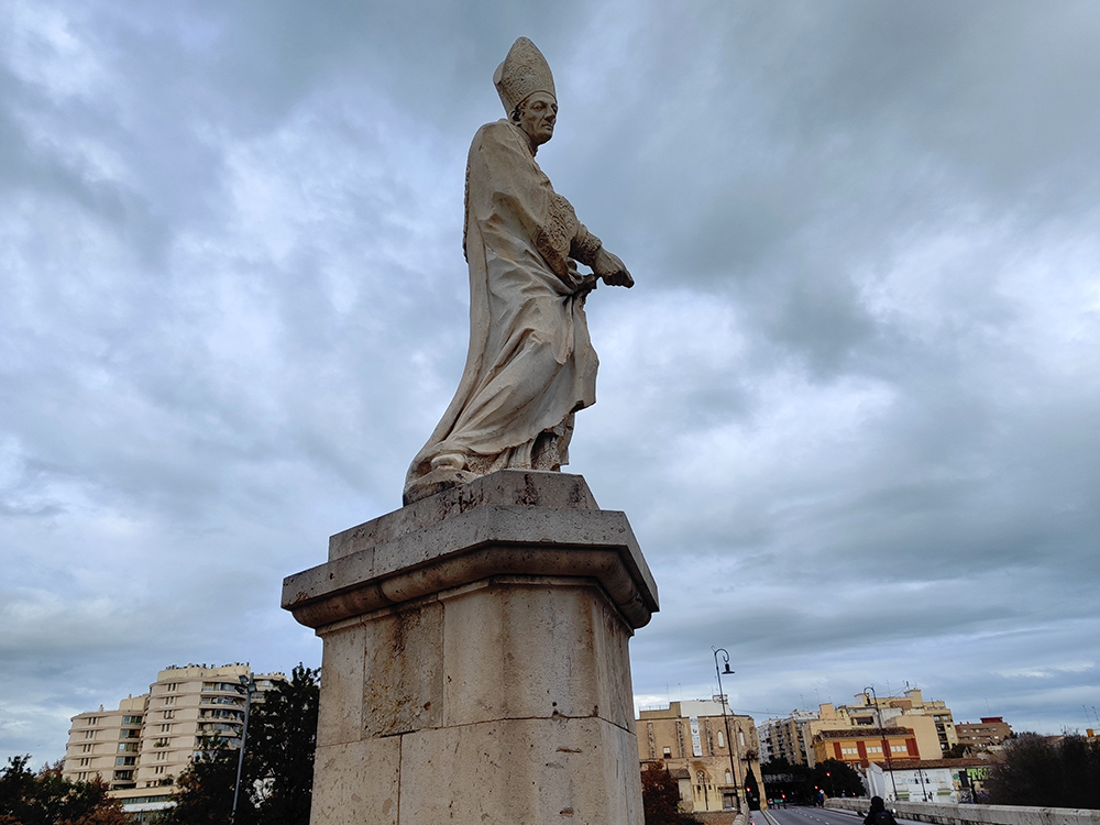 Статуя в барочном стиле работы итальянского скульптора Джакомо Понзанелли (Giacomo Ponzanelli) стоит на высоком пьедестале. Она изображает святого в епископских одеждах с митрой на голове и жестом благословения. Это одна из двух похожих статуй (вторая — святого Луиса Бертрана), которые сейчас находятся на мосту Тринидад (Puente de la Trinidad) — одном из исторических мостов Валенсии через бывшее русло реки Турия (сейчас это сады Турия).