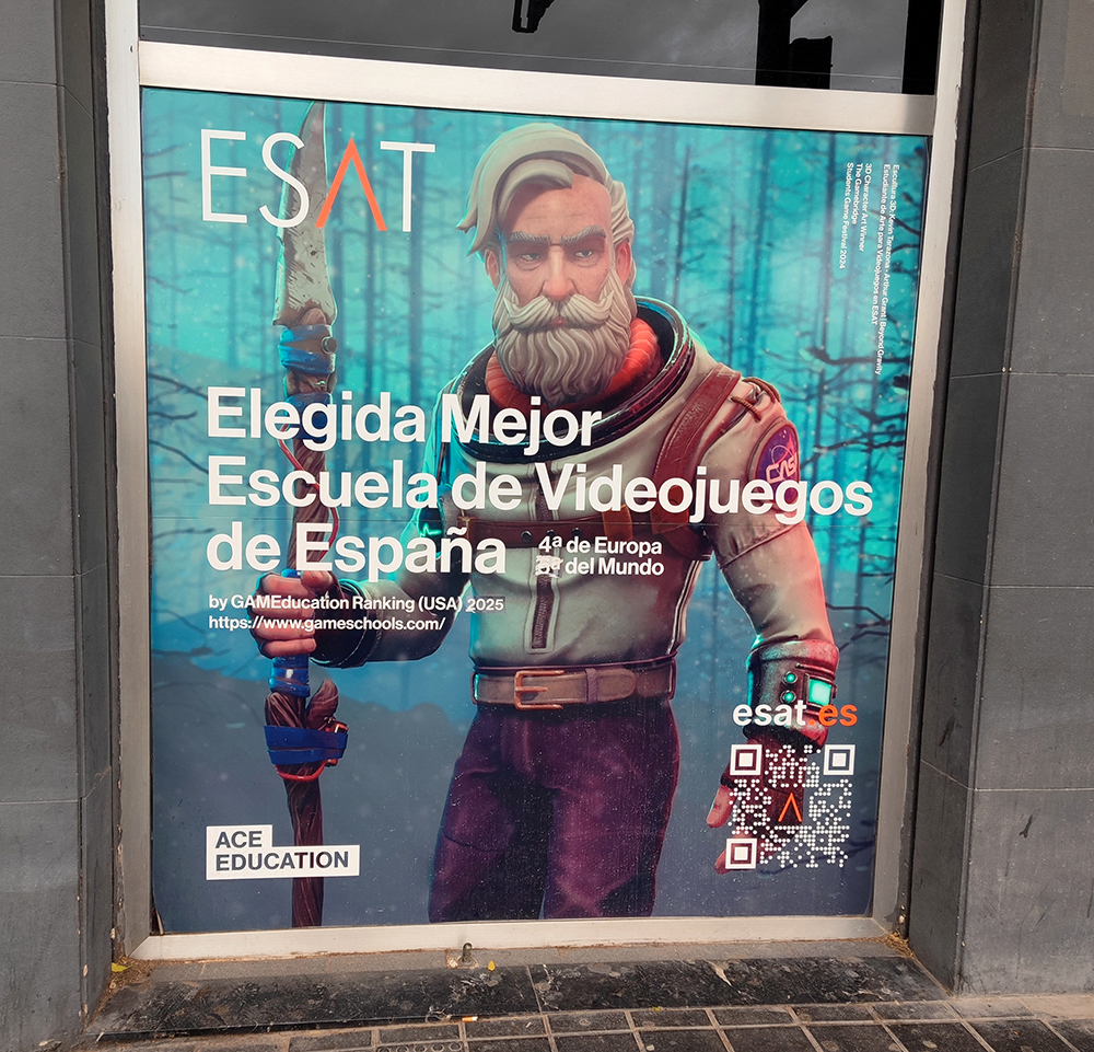 Рекламный плакат ESAT (Escuela Superior de Arte y Tecnología) — высшей школы искусства и технологий в Валенсии. Школа специализируется на обучении разработке видеоигр, цифровому искусству, дизайну и программированию.