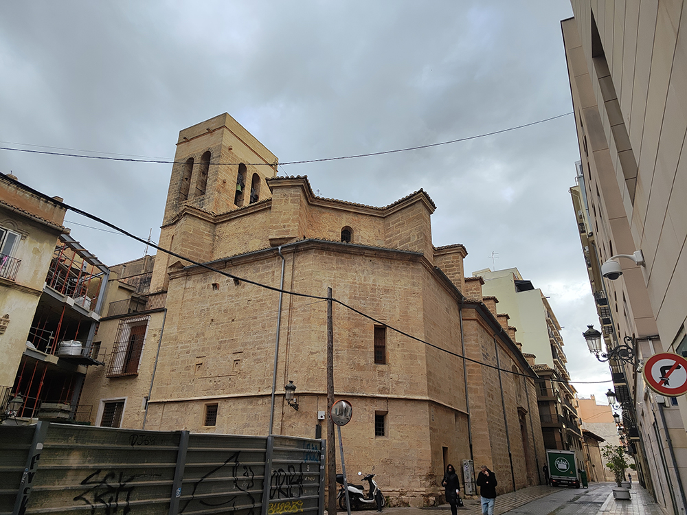 На фото — полигональный абсид (многоугольная апсида) из светлого камня, небольшая башня-колокольня сверху и окружающие узкие улочки исторического центра (район El Carmen). Церковь плотно встроена в городскую застройку, что типично для старых кварталов Валенсии.