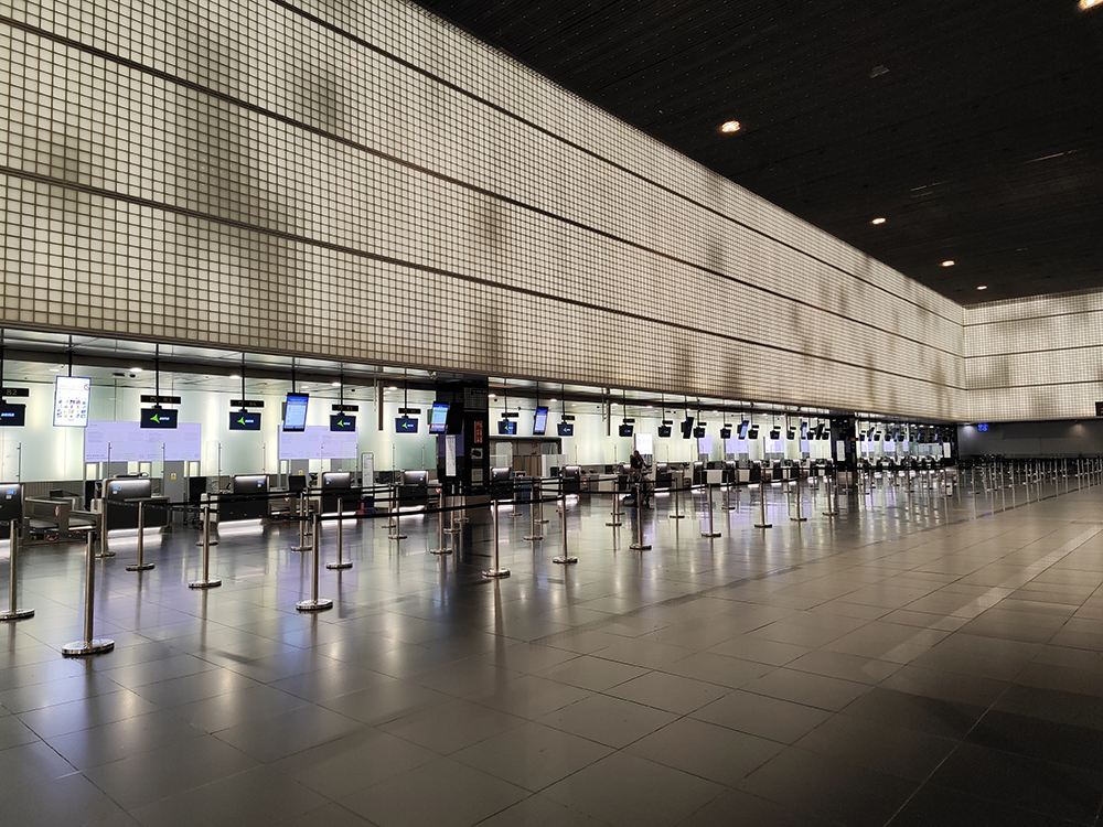 Аэропорт вечером. Рейсов пока нет, сотрудниц — тоже.