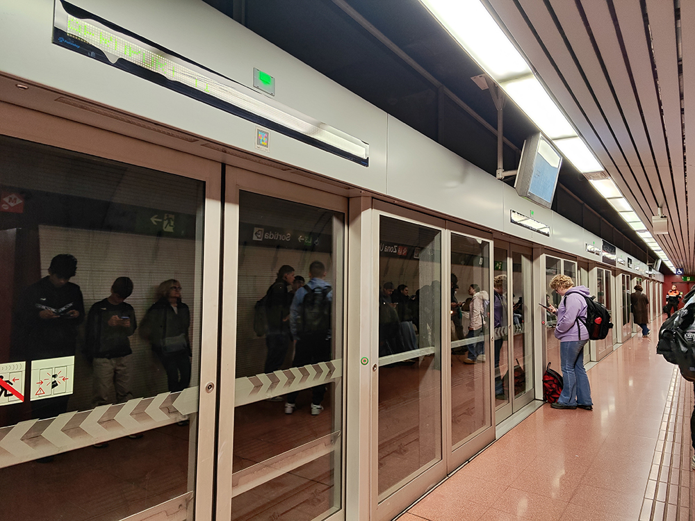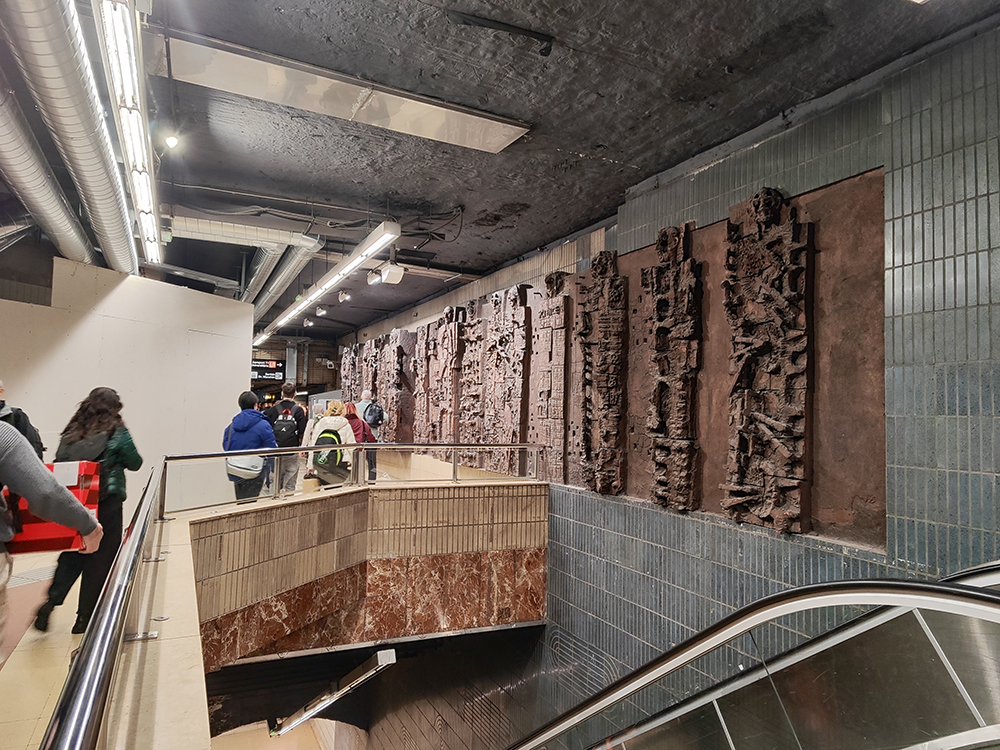 Станция метро. На стене находится большая скульптурная композиция — рельефный мурал работы Josep Maria Subirachs, известного своими абстрактными и геометрическими формами (он также автор частей фасада Sagrada Família).