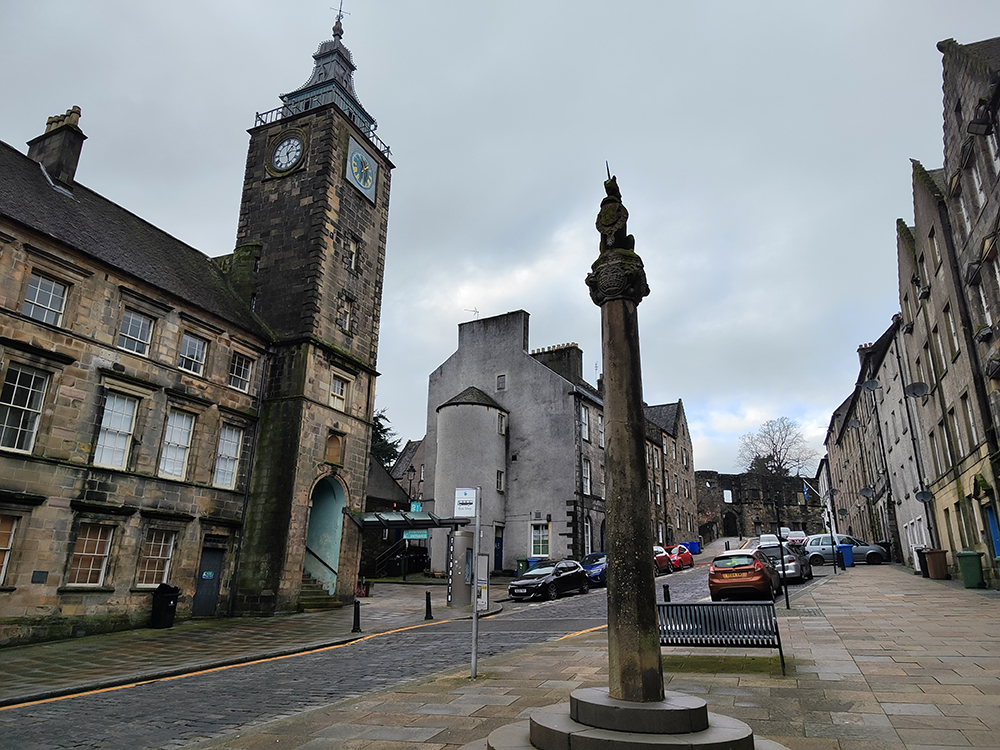 Высокая колонна с фигурой на вершине — это Mercat Cross (Меркат-кросс). Это традиционный шотландский рыночный крест, символизировавший право города проводить рынки и объявлять официальные новости.