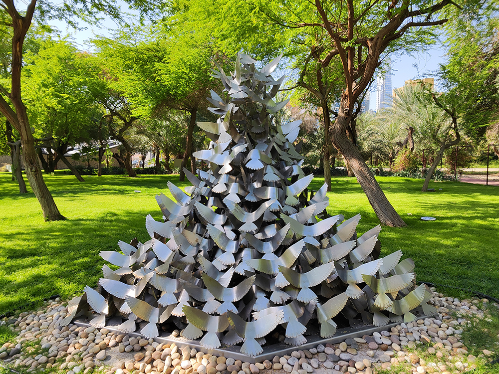 Скульптура “Свобода”. Птицы символизируют мучеников/шахидов Кувейта — души, возносящиеся к свободе после жертв во имя страны (особенно в контексте Освобождения 1991 года). С определённого ракурса сбоку силуэт птиц складывается в контур карты Кувейта.